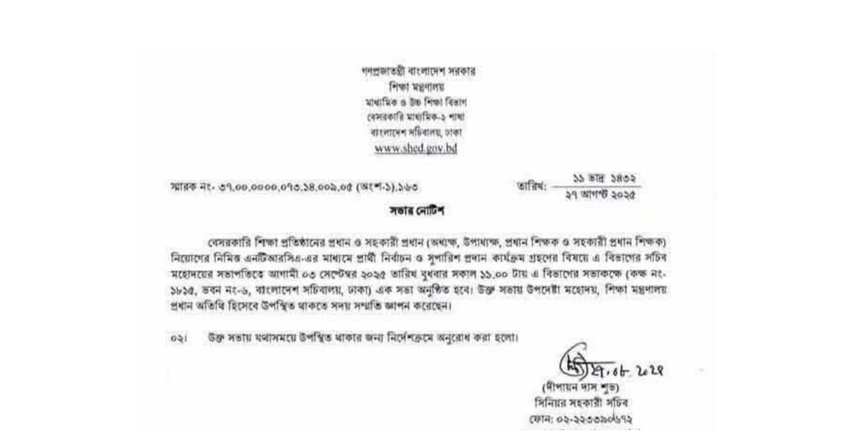বেসরকারি শিক্ষাপ্রতিষ্ঠানের প্রধান (অধ্যক্ষ, উপাধ্যক্ষ, প্রধান শিক্ষক) ও সহপ্রধান (সহকারী প্রধান শিক্ষক) নিয়োগের দায়িত্ব বেসরকারি শিক্ষক নিবন্ধন ও প্রত্যয়ন কর্তৃপক্ষের (এনটিআরসিএ) হাতে দেওয়ার প্রক্রিয়া চূড়ান্ত হওয়ার পথে। দীর্ঘদিন ধরে আলোচিত এ বিষয়ে আগামী ৩ সেপ্টেম্বর সকাল ১১টায় বাংলাদেশ সচিবালয়ে শিক্ষা মন্ত্রণালয়ের সভায় চূড়ান্ত সিদ্ধান্ত হতে পারে বলে জানা গেছে।